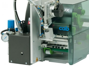 Aplicator pentru etichete autoadezive destinat instalarii in partea frontala a imprimantelor CAB din seria Squix. Sistemul permite aplicarea etichetelor in mod semi-automat sau automat prin intermediul unui brat cilindric actional pneumatic ce poate aplica etichete cu latimi intre 25 si 176mm.